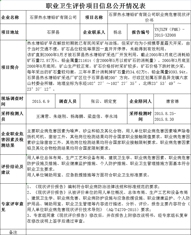 17-職業衛生(shēng)評價項目信息公開情況表-YNJXZW(FMK)-2015-XZ008