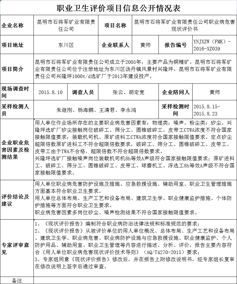 17-職業衛生(shēng)評價項目信息公開情況表-YNJXZW(FMK)-2016-XZ039