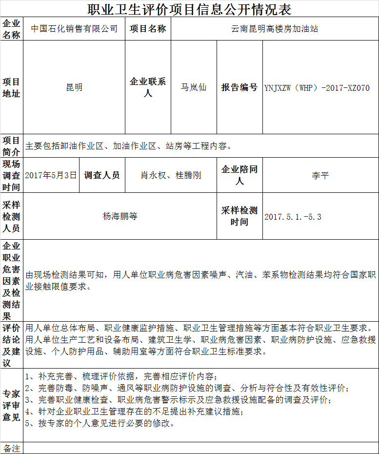 17-職業衛生(shēng)評價項目信息公開情況表YNJXZW(WHP)-2017-XZ070