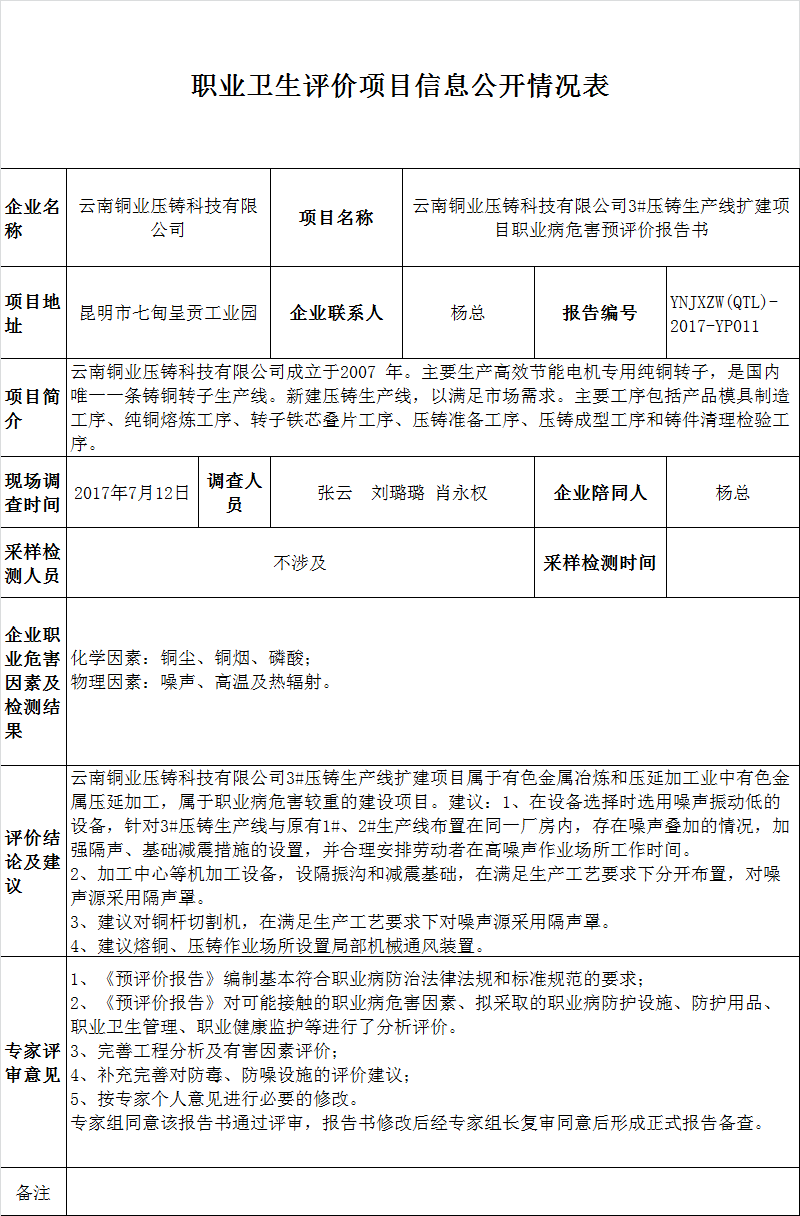 17-職業衛生(shēng)評價項目信息公開情況表-YNJXZW(QTL)-2017-YP011