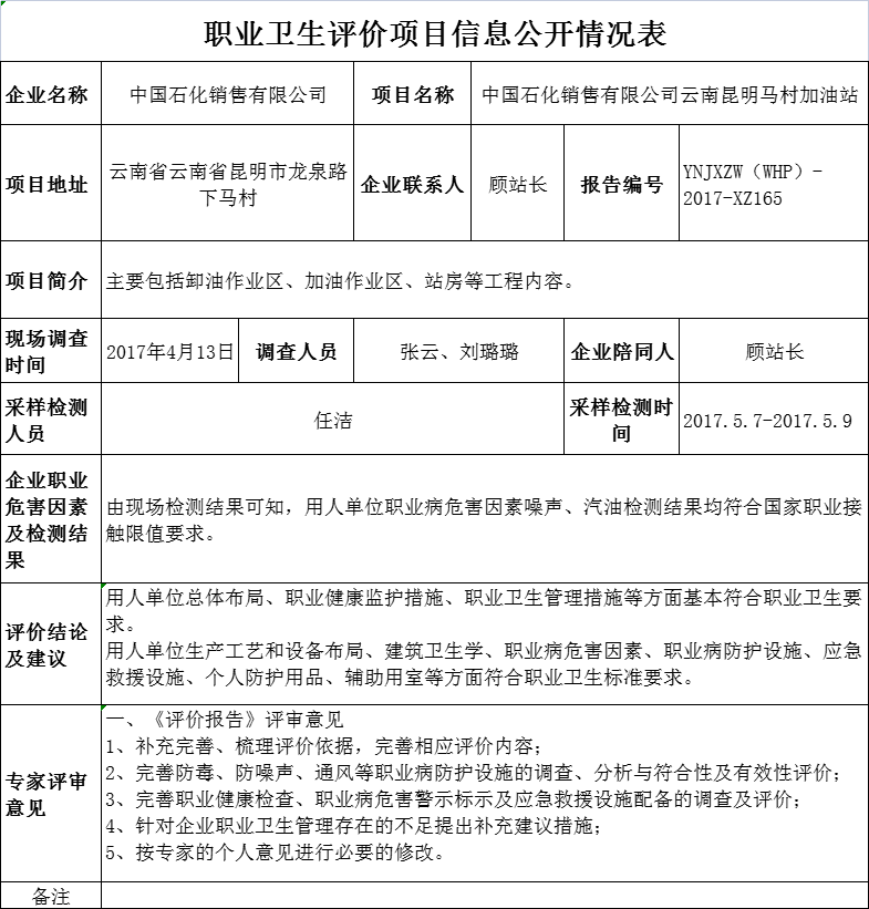 17-職業衛生(shēng)評價項目信息公開情況表-YNJXZW(WHP)-2017-XZ165