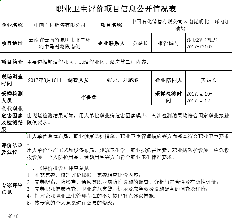17-職業衛生(shēng)評價項目信息公開情況表-YNJXZW(WHP)-2017-XZ167