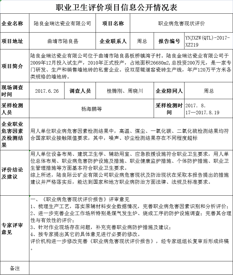 17-職業衛生(shēng)評價項目信息公開情況表-YNJXZW(QTL)-2017-XZ219