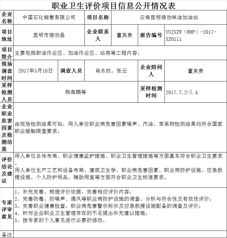 17-職業衛生(shēng)評價項目信息公開情況表YNJXZW(WHP)-2017-XZ0111