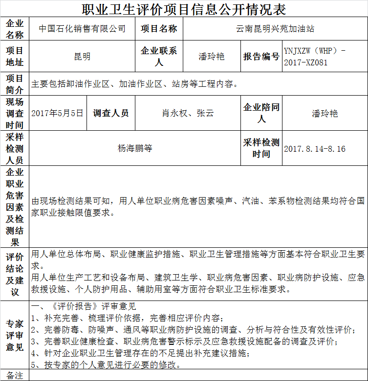 17-職業衛生(shēng)評價項目信息公開情況表YNJXZW(WHP)-2017-XZ081