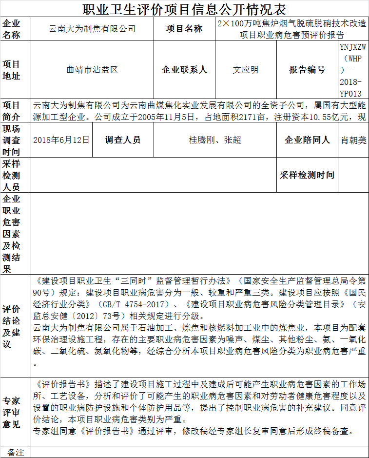 18-職業衛生(shēng)評價項目信息公開情況表YNJXZW(WHP)-2018-YP013