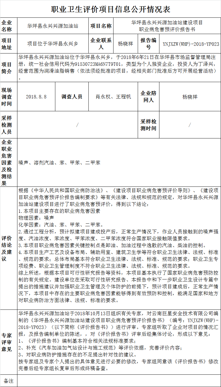 18-職業衛生(shēng)評價項目信息公開情況表YNJXZW(WHP)-2018-YP023