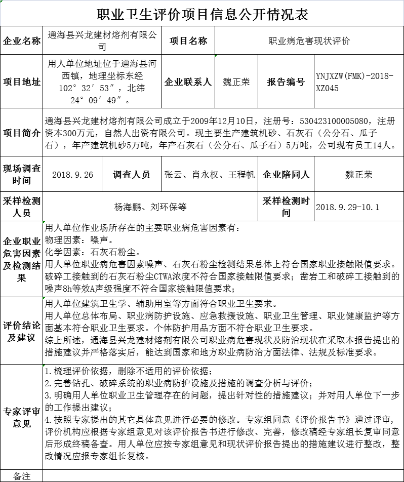 18-職業衛生(shēng)評價項目信息公開情況表-YNJXZW(FMK)-2018-XZ045