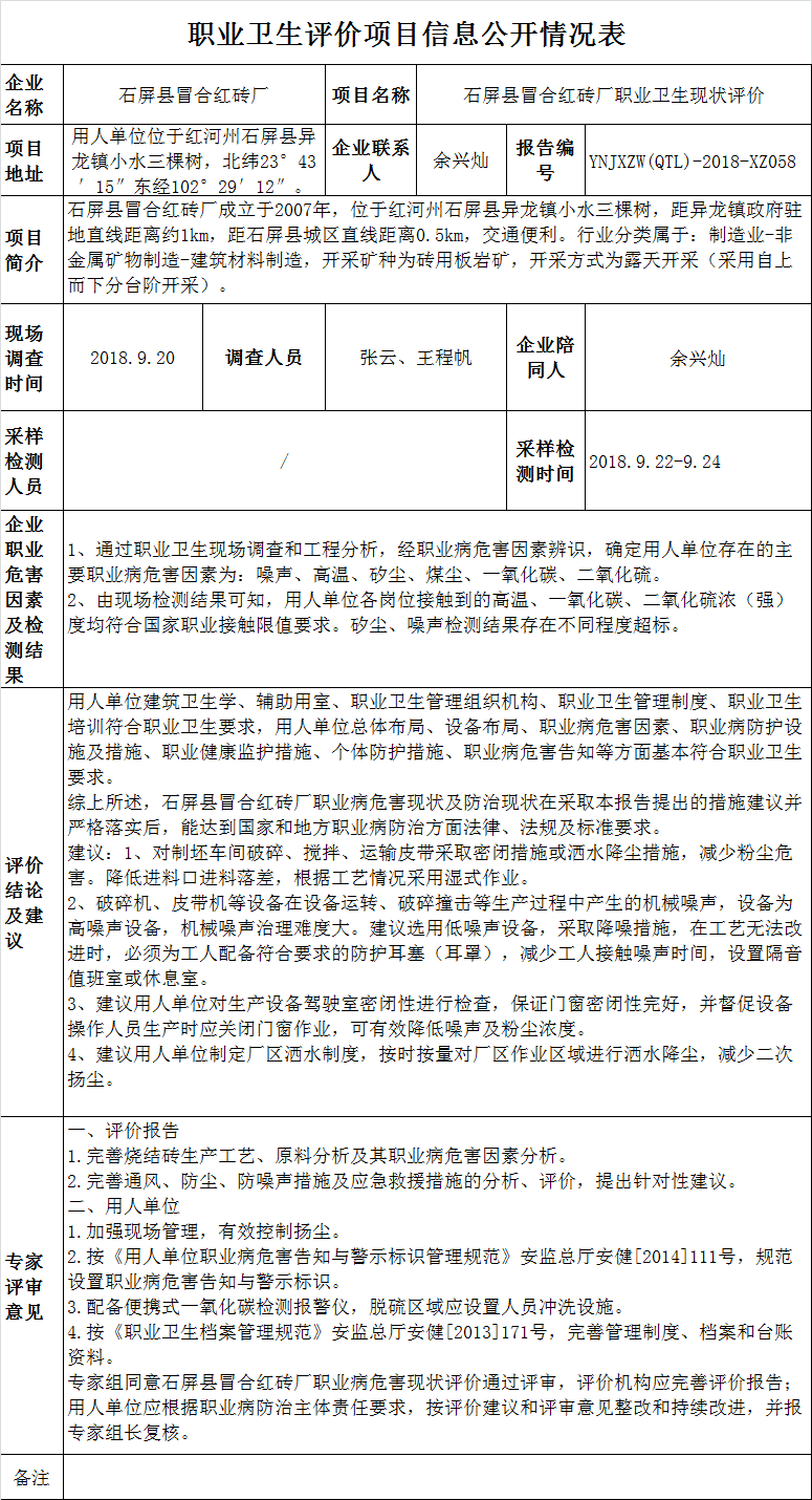 18-職業衛生(shēng)評價項目信息公開情況表YNJXZW(FMK)-2018-XZ058
