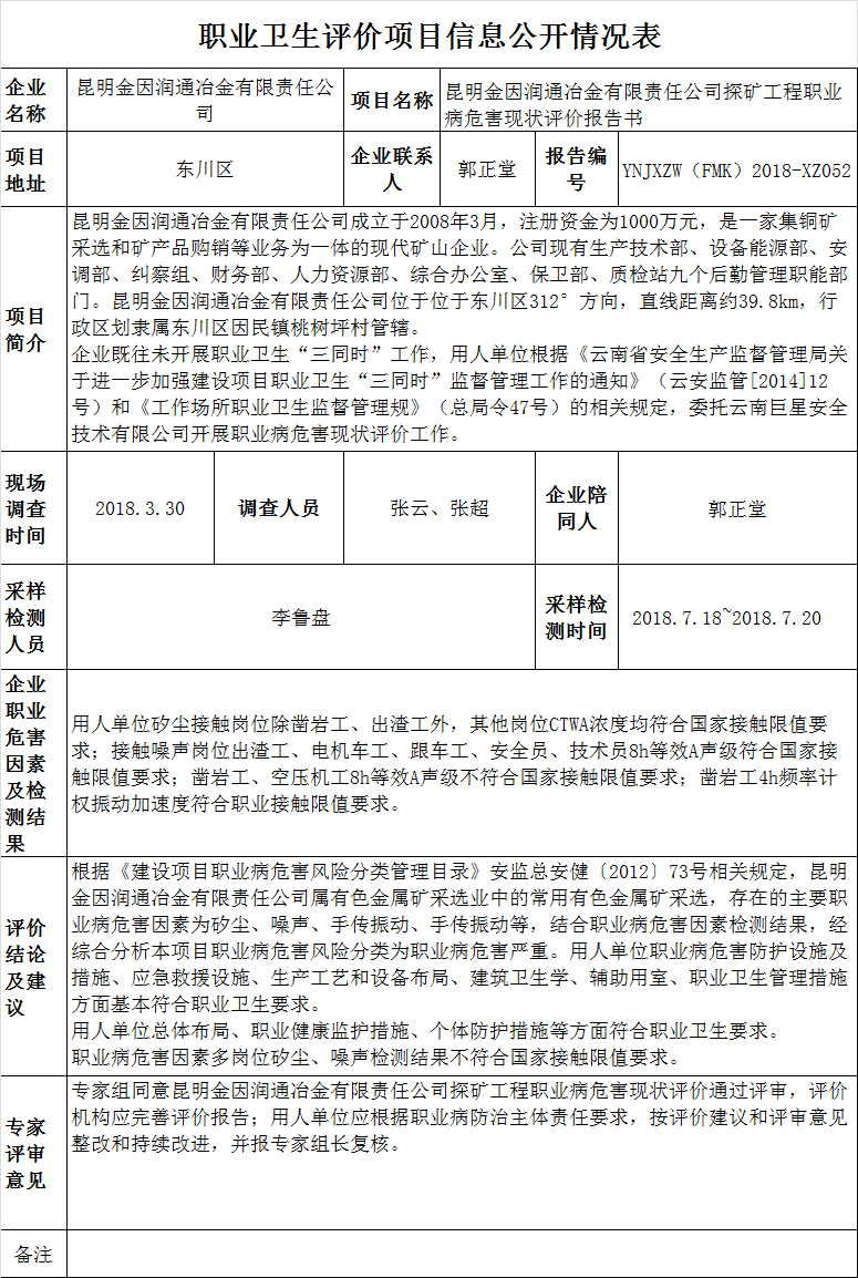 18-職業衛生(shēng)評價項目信息公開情況表YNJXZW(FMK)-2018-XZ052