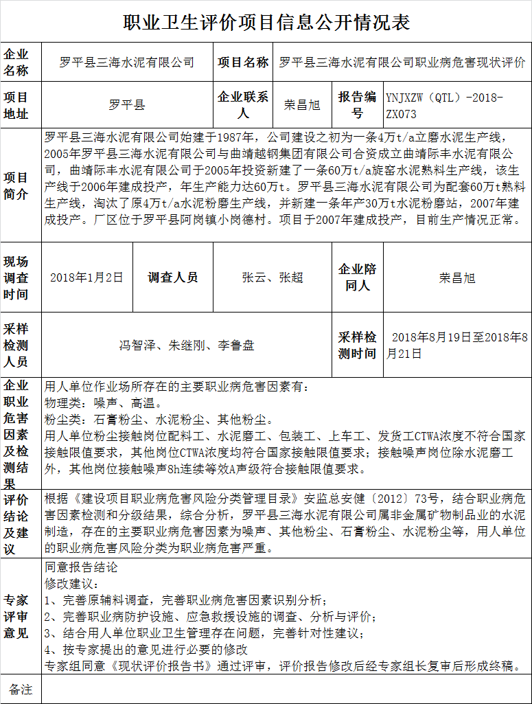 19-職業衛生(shēng)評價項目信息公開情況表YNJXZW(QTL)-2018-XZ073