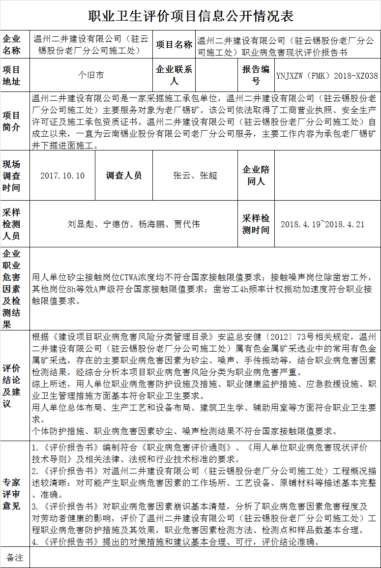 19-職業衛生(shēng)評價項目信息公開情況表YNJXZW(FMK)-2018-XZ038