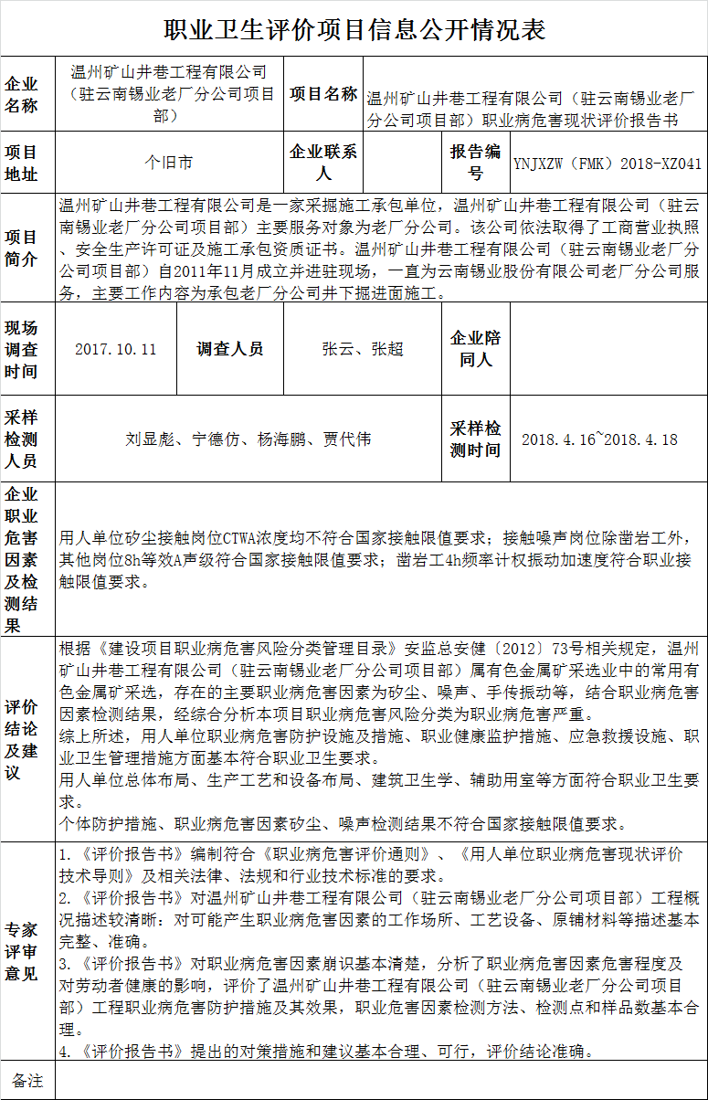 19-職業衛生(shēng)評價項目信息公開情況表YNJXZW(FMK)-2018-XZ041