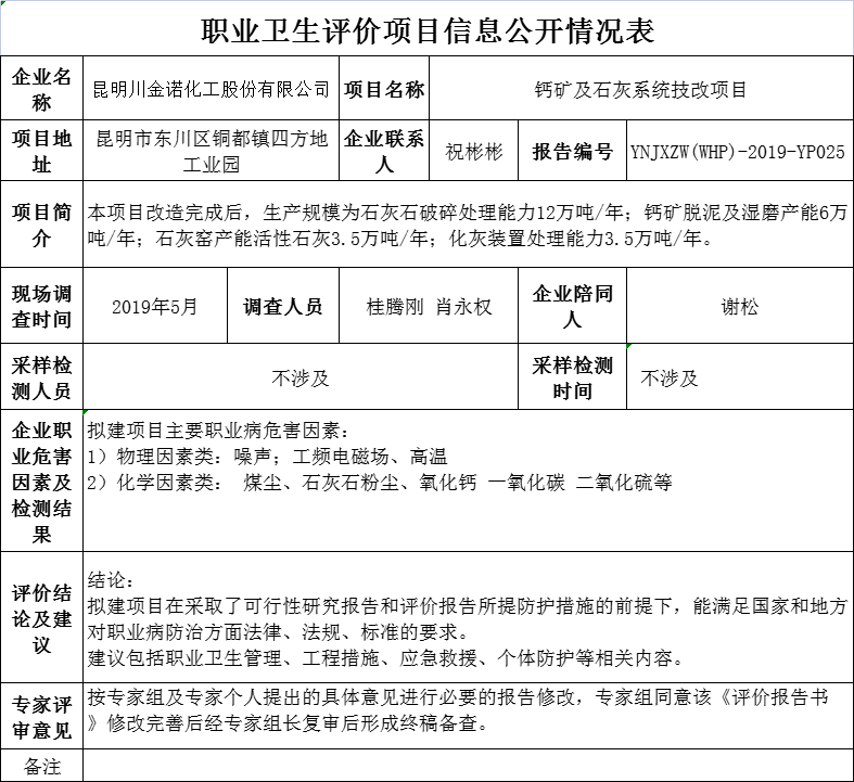 19-職業衛生(shēng)評價項目信息公開情況表YNJXZW(WHP)-2019-YP025