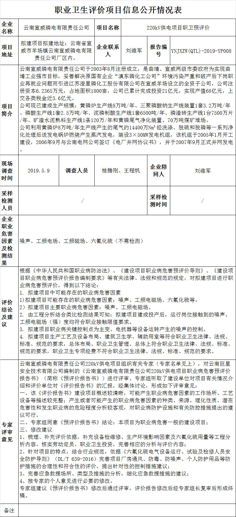 19-職業衛生(shēng)評價項目信息公開情況表YNJXZW(QTL)-2019-YP008