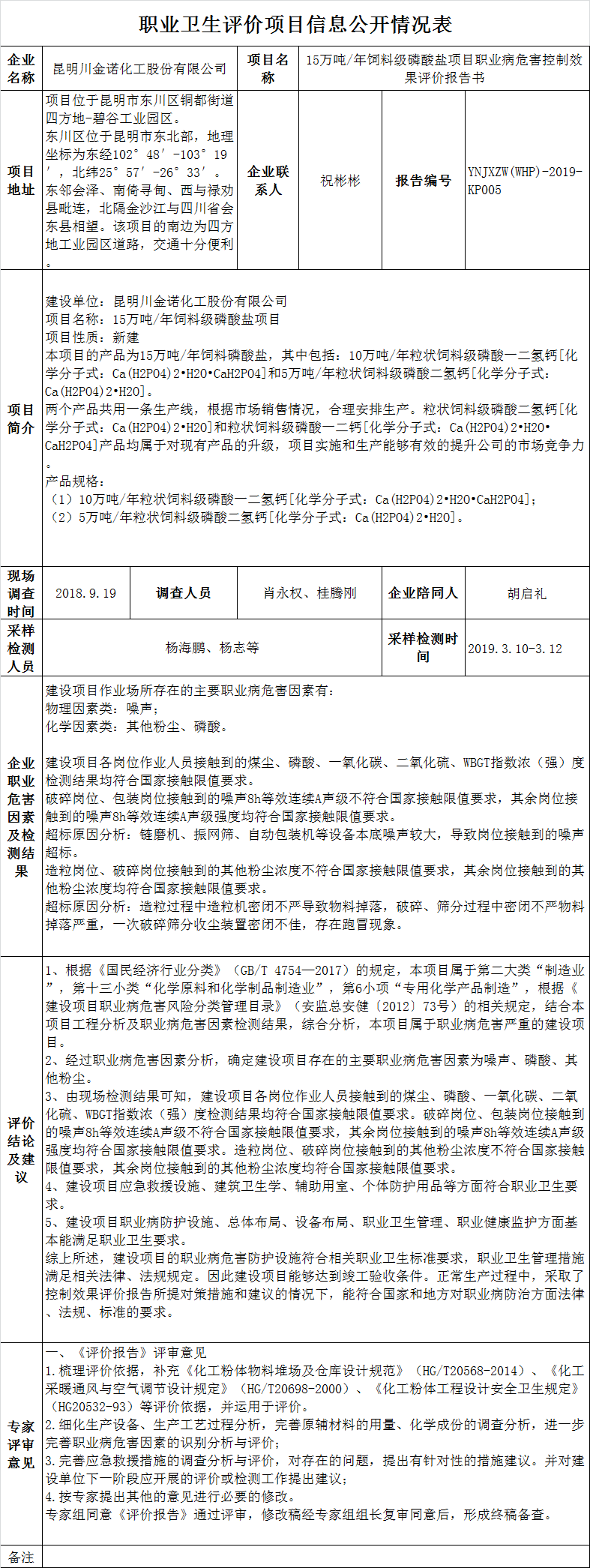 19-職業衛生(shēng)評價項目信息公開情況表YNJXZW(WHP)-2019-KP005