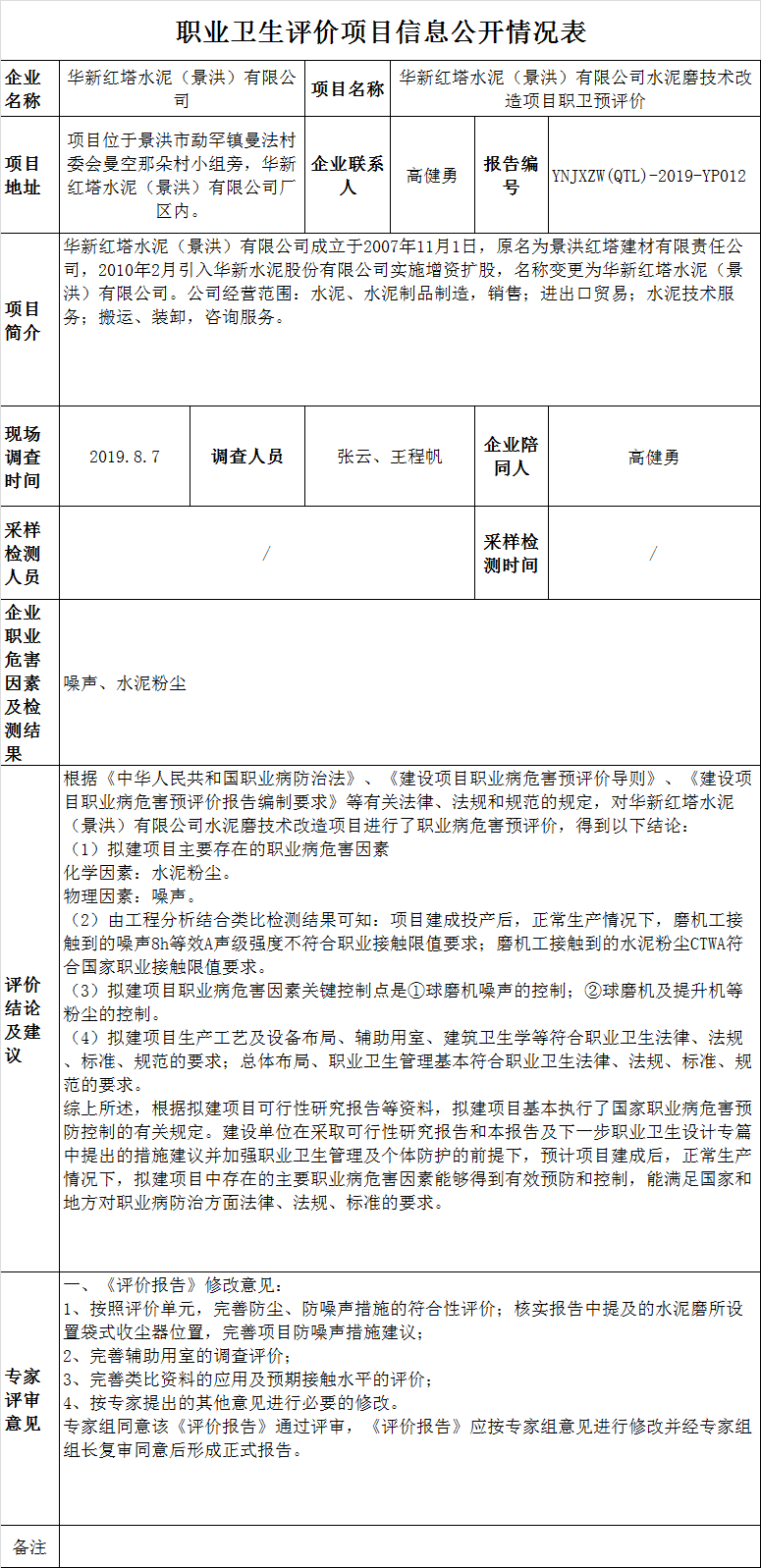 19-職業衛生(shēng)評價項目信息公開情況表YNJXZW(QTL)-2019-YP012