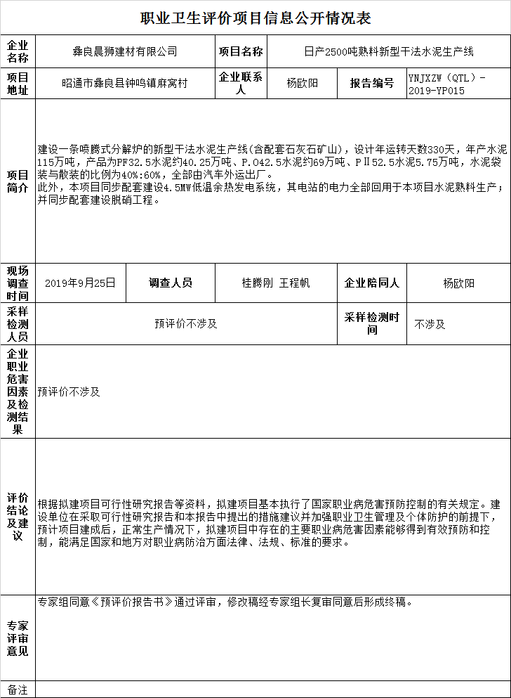 19-職業衛生(shēng)評價項目信息公開情況表YNJXZW(QTL)-2019-YP015