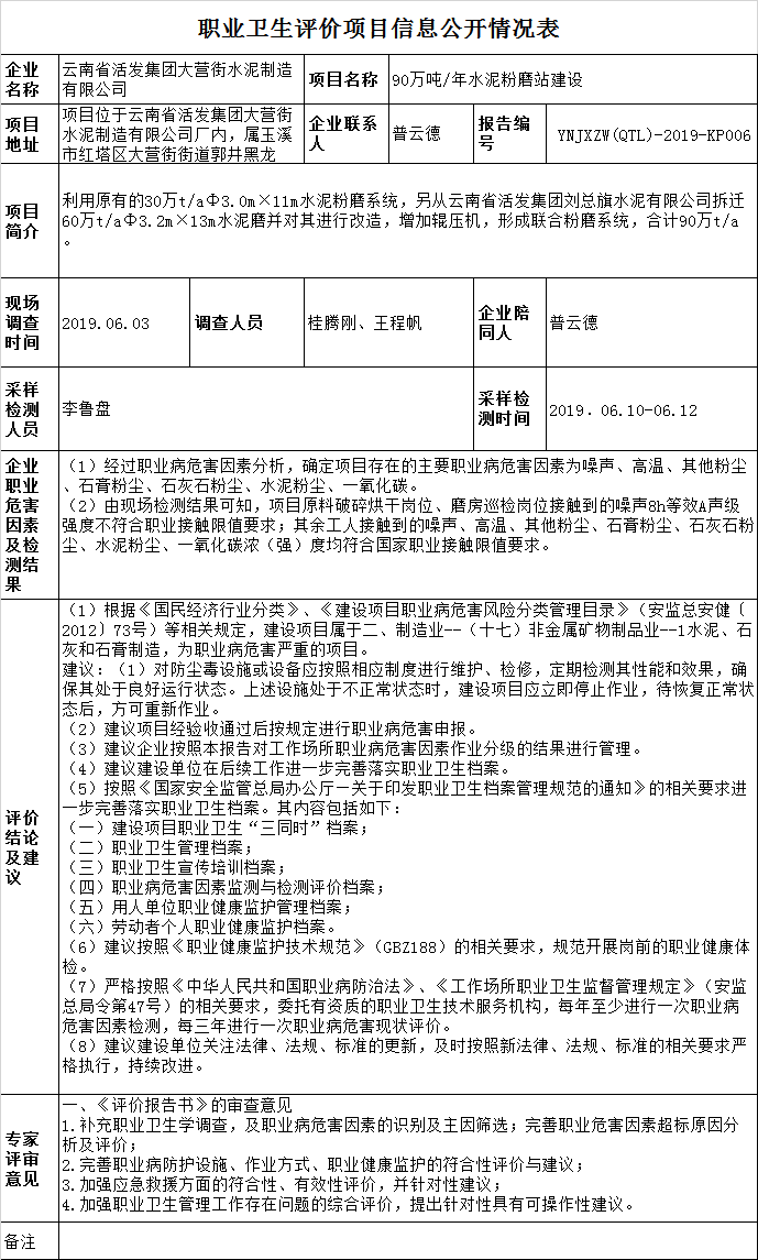 19-職業衛生(shēng)評價項目信息公開情況表YNJXZW(QTL)-2019-KP006