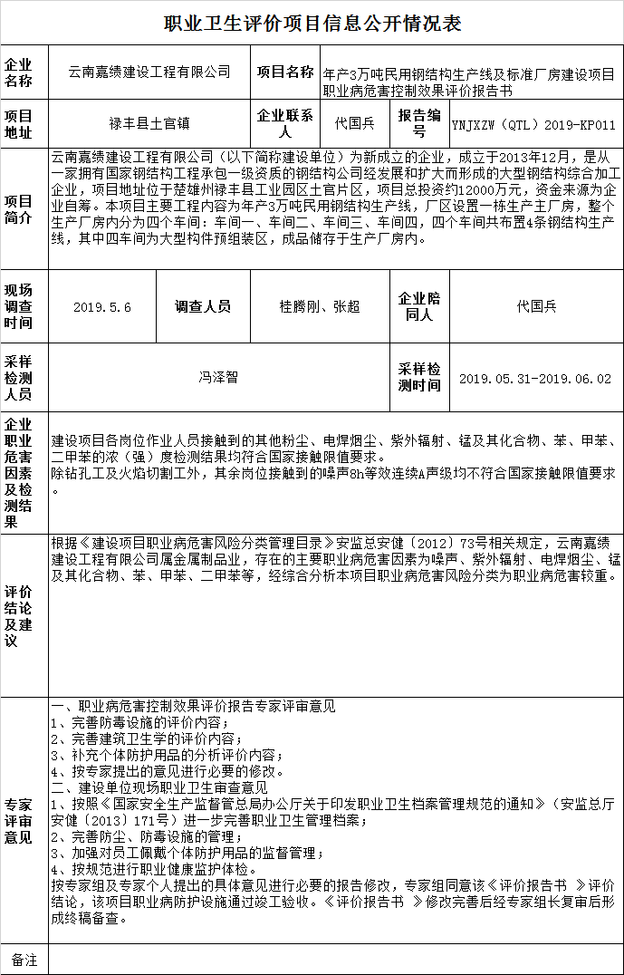 19-職業衛生(shēng)評價項目信息公開情況表YNJXZW(QTL)-2019-KP011
