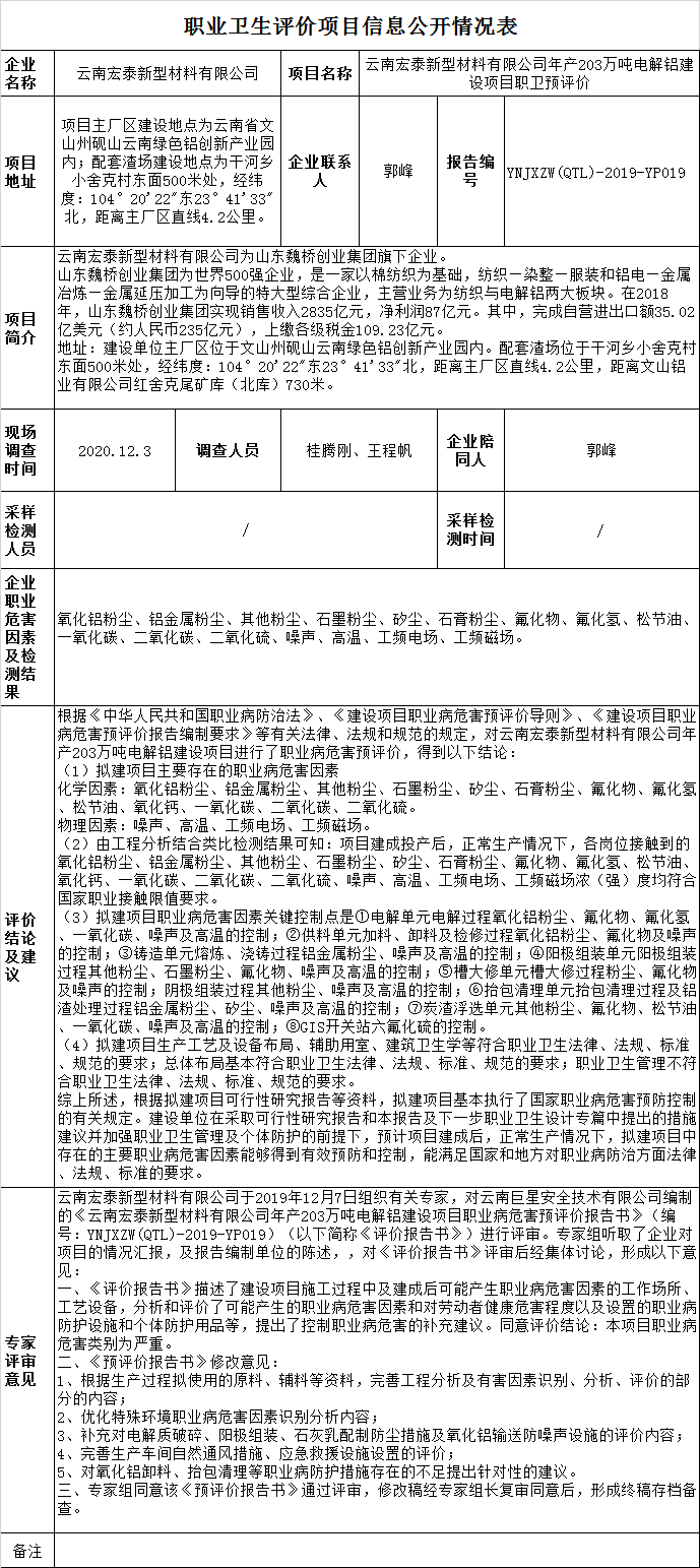 19-職業衛生(shēng)評價項目信息公開情況表YNJXZW(QTL)-2019-YP019