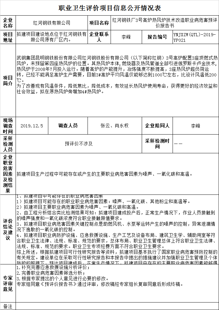 19-職業衛生(shēng)評價項目信息公開情況表YNJXZW(QTL)-2019-YP021