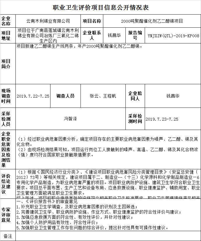 19-職業衛生(shēng)評價項目信息公開情況表YNJXZW(QTL)-2019-KP008