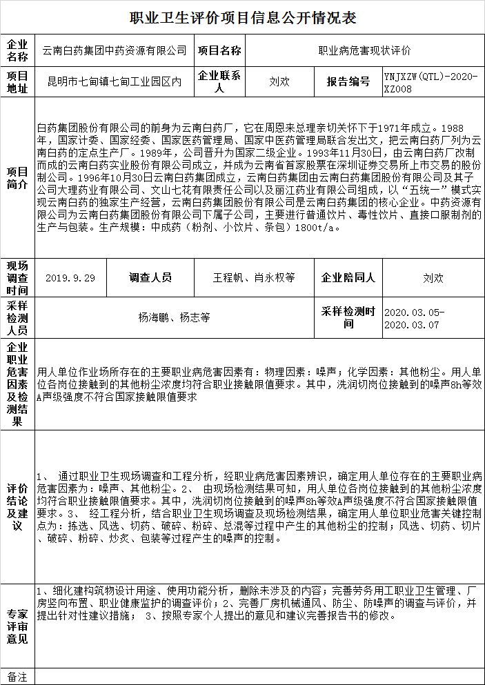 20-職業衛生(shēng)評價項目信息公開情況表YNJXZW(QTL)-2020-XZ008