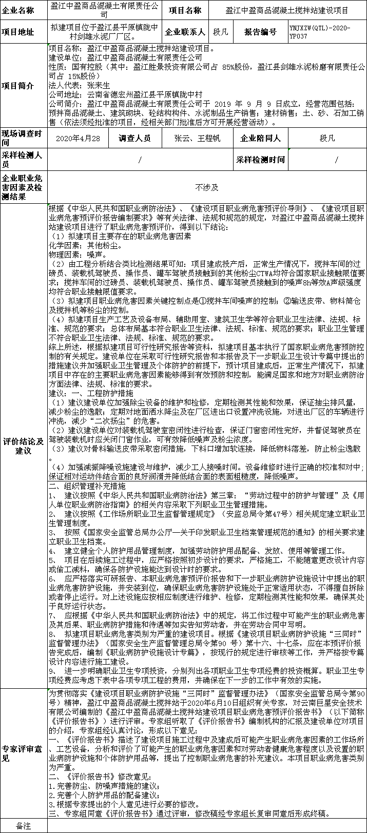 20-職業衛生(shēng)評價項目信息公開情況表-YNJXZW(QTL)-2020-YP037
