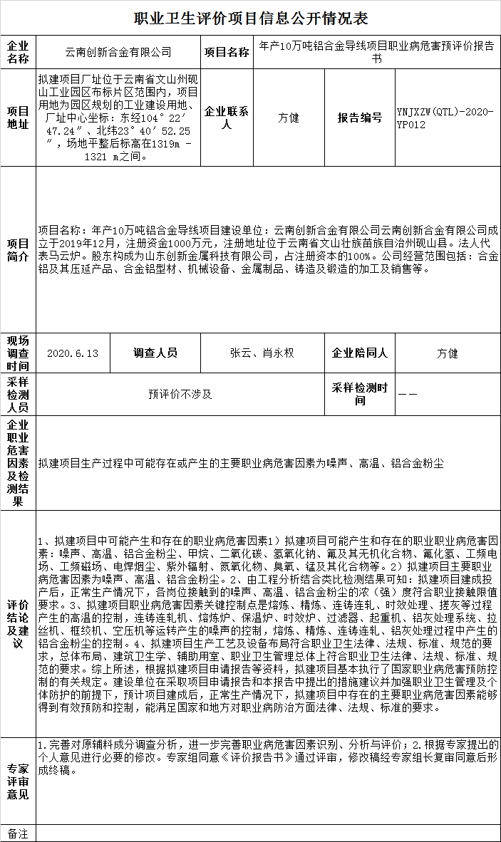 20-職業衛生(shēng)評價項目信息公開情況表YNJXZW(QTL)-2020-YP012