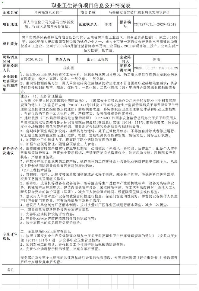 20-職業衛生(shēng)評價項目信息公開情況表YNJXZW(QTL)-2020-XZ018