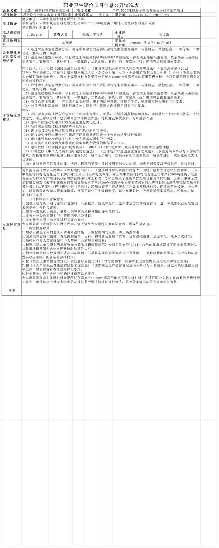 20-職業衛生(shēng)評價項目信息公開情況表YNJXZW(QTL)-2020-KP024