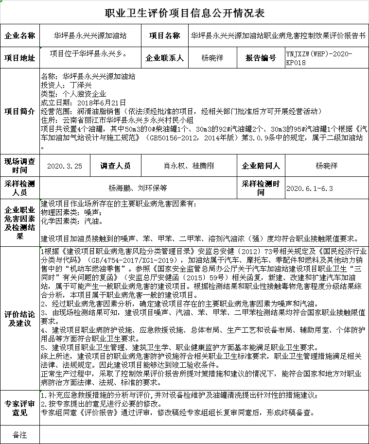 20-職業衛生(shēng)評價項目信息公開情況表YNJXZW(WHP)-2020-KP018