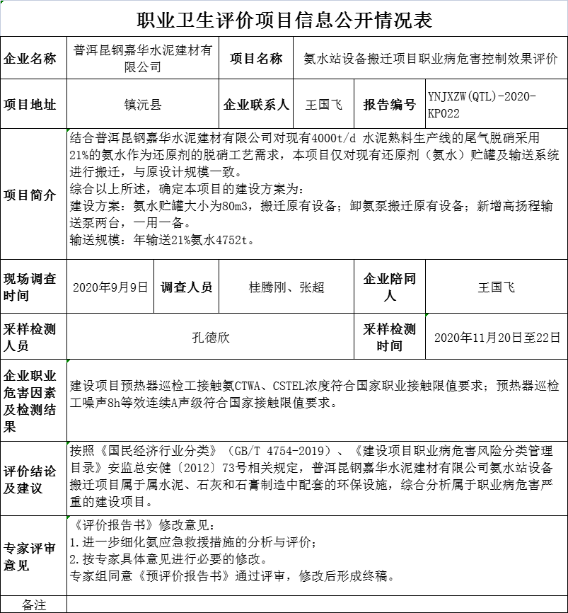 20-職業衛生(shēng)評價項目信息公開情況表-YNJXZW(QTL)-2020-KP022