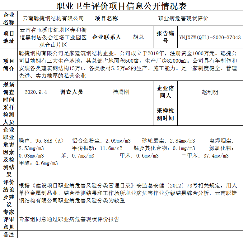 20-職業衛生(shēng)評價項目信息公開情況表-YNJXZW(QTL)-2020-XZ043