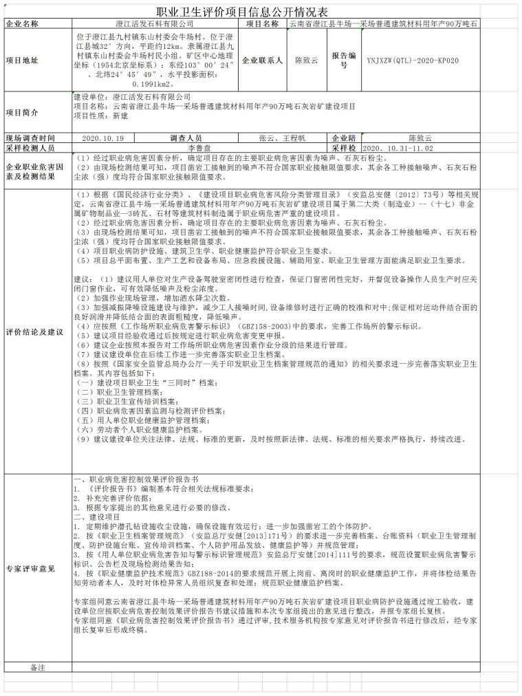 20-職業衛生(shēng)評價項目信息公開情況表-YNJXZW(QTL)-2020-KP020