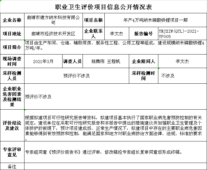 21-職業衛生(shēng)評價項目信息公開情況表YNJXZW(QTL)-2021-YP005