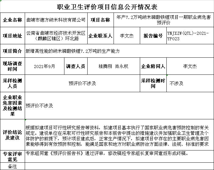 21-職業衛生(shēng)評價項目信息公開表YNJXZW(QTL)-2021-YP023