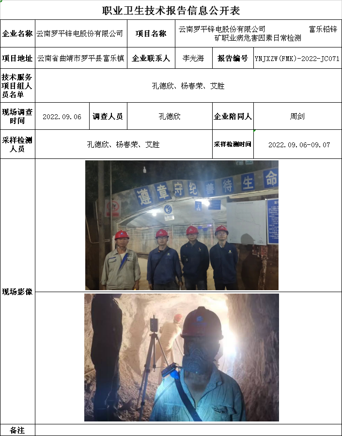22-職業衛生(shēng)技術(shù)報告信息公開表 YNJXZW(FMK)-2022-JC071