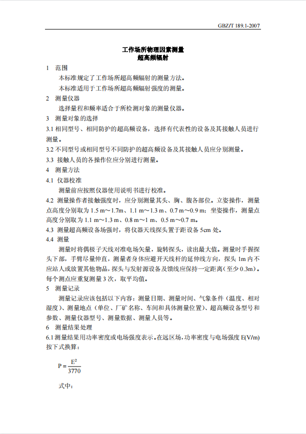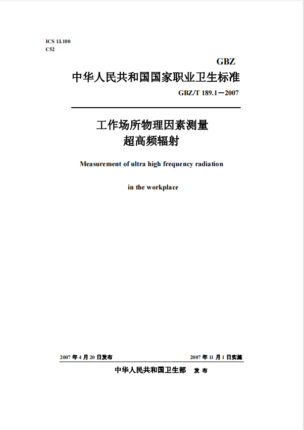 GBZT 189.1- 2007 工(gōng)作(zuò)場所物理(lǐ)因素測量 超高頻輻射