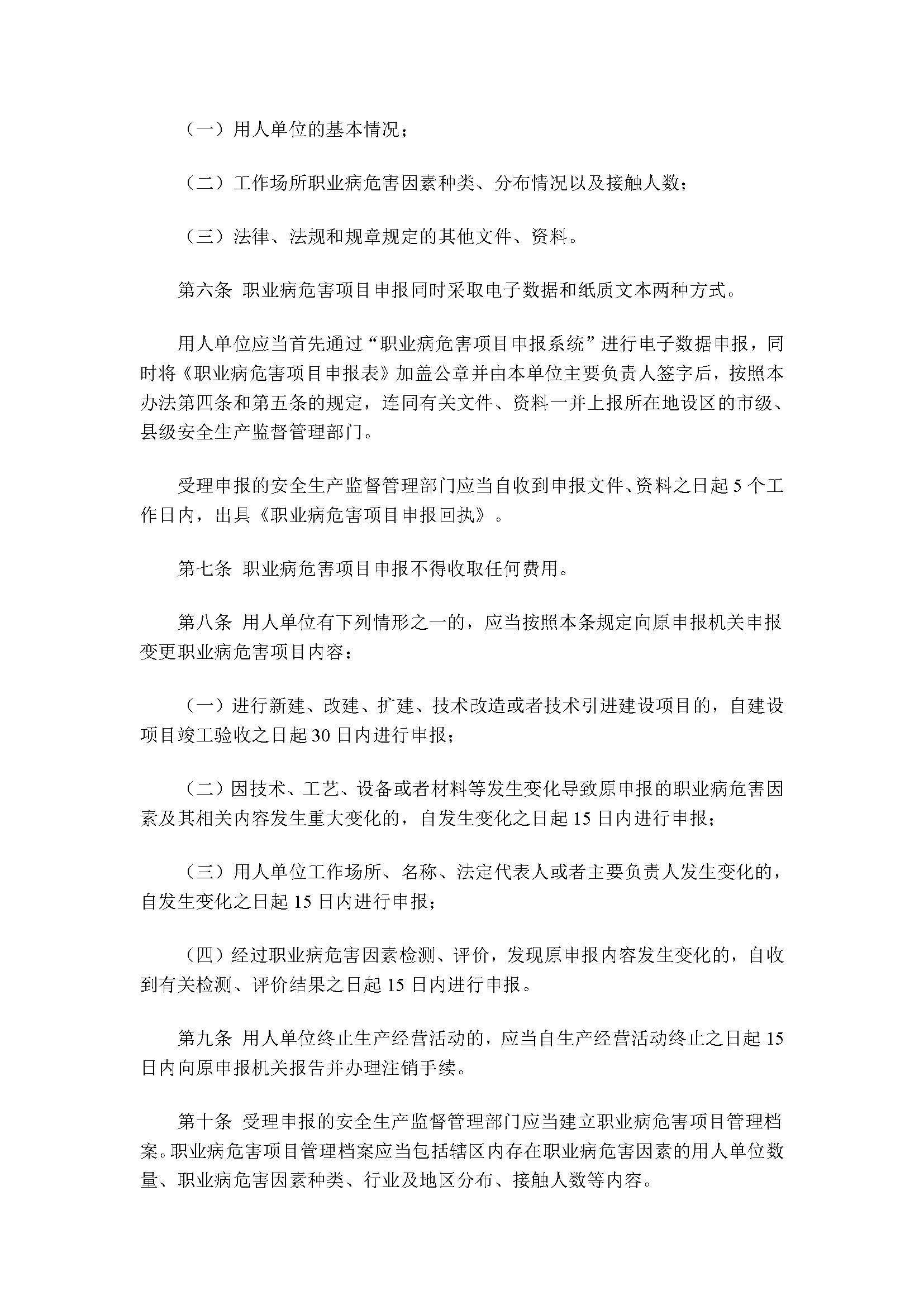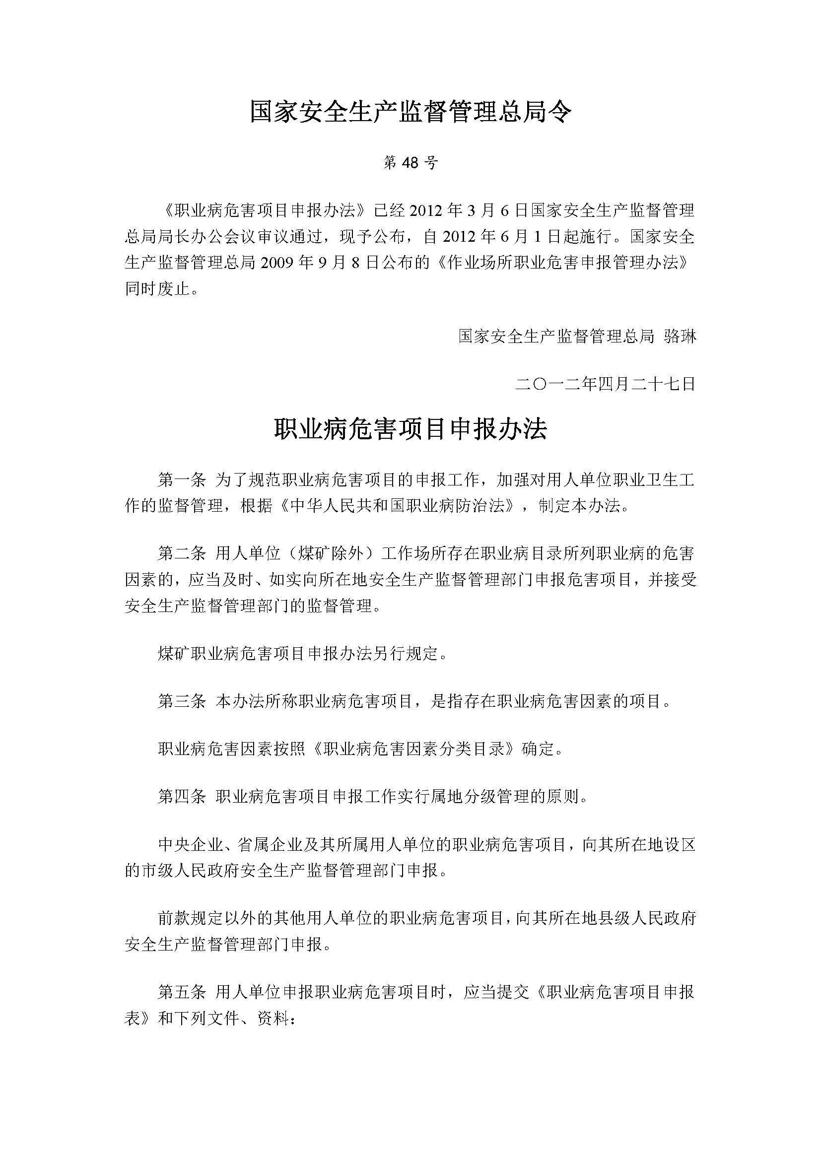 《職業病危害項目申報辦法》(安監總局第48号令)
